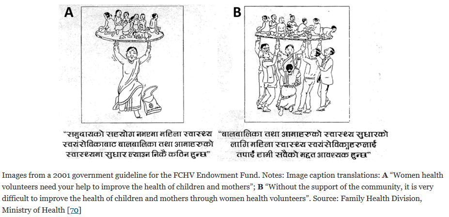 "For Nepal's FCHVs [female community health volunteers], it has been argued that their volunteer status is exactly what has earned them their community respect and trust...as payment would otherwise threaten their social status in their communities.... But this ignores the deeply gendered aspects of CHW labor and remuneration..."