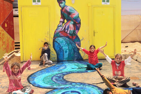 With the goal of addressing these issues and improving the lives of refugee children in the Za'atari Camp in northern Jordan, artist Joel Bergner traveled to Za'atari in 2013, 2014, and 2015 to partner with a team of Syrian refugees, artists, and educators to lead workshops with children and to make art. Through discussions and artmaking, they learned about water conservation, hygiene issues in the camp, artistic techniques, and conflict resolution, while also exploring social issues, their longing to return to Syria, their dreams for the future, and their plight as refugees. The children had the opportunity to participate and add their own creativity to murals that they created throughout the camp, "adding color and life to the desolate environment and spreading messages of hope to camp residents."