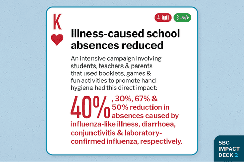 Compared with results for the control group, in the intervention group, overall absences caused by influenza-like illness, diarrhoea, conjunctivitis, and laboratory-confirmed influenza were reduced by 40%, 30%, 67%, and 50%, respectively (p<0.0001 for each illness). In addition, laboratory-confirmed influenza decreased 47% in schools that participated in the 12-week intensive hand hygiene programme, compared to schools that did not participate. Absenteeism caused by diarrhoea was also 33% lower among schoolchildren in the schools that participated.