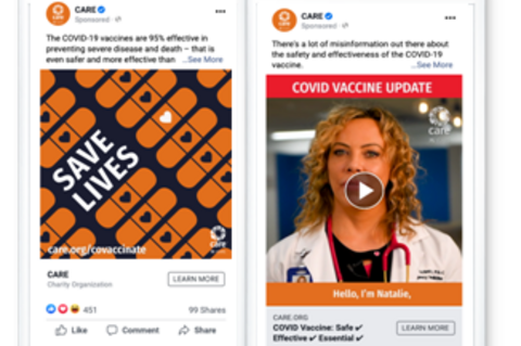 "COVID-19 Vaccine Confidence: CARE Launches Pro-Vaccine Ad Campaign", by Jessica Kirkwood and Mary Kate Wilson, July 1 2021; email from Rachel Kent to The Communication Initiative on July 9 2021; "Social and Behavioral Change Communications Campaigns to Reduce Vaccine Hesitancy", by Jessica Kirkwood and Mary Kate Wilson, July 30 2021; "COVID-19 and Social Media: Using Facebook to Drive Social and Behavioral Change in 19 Countries", by Jessica Kirkwood, Mary Kate Wilson, and Brandie Feuer, September 2 2021; and "Faith Leadership and Vaccine Hesitancy Reduction", by Jessica Kirkwood and Mary Kate Wilson, September 8 2021. Image credit: CARE