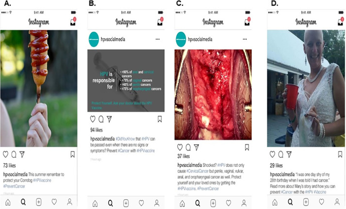 Participants also assessed the appeal of 8 Instagram graphic mock-ups promoting HPV vaccination to prevent cancer. (The researchers chose Instagram because, nationally, it is the most-used social media app among young adults age 18-29 years.) The graphics represented 4 categories: 1) infographics, since such graphics are often used by professional health organisations advocating for HPV vaccination; 2) disease photos attempting to elicit fear or disgust; 3) young adult cancer patient photos attempting to elicit sadness; and 4) humourous graphics attempting to elicit happiness. Each mock-up had Instagram-style text encouraging HPV vaccination to prevent cancer (e.g., "This summer remember to protect your corndog #HPVvaccine #PreventCancer", with a photo of a corndog). For each image, a survey question asked, "If this message showed up in your Instagram feed how likely is it that you would stop to read it?" Response options ranged from "very unlikely" (1) to "very likely" (5).