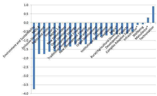 The result of this combined analysis led author Richard Heeks to assert the "fifteen for post-2015" largest DI research gaps in terms of topic (with what he calls "Development 2.0" shown where he feels it should appear in priority terms but without being numbered): (i) Environment and Sustainability, (ii) Poverty, (iii) Development Management, (iv) Food and Agriculture, (v) Development Finance, (vi) Inclusive Development, (vii) Rights and Justice, (viii) Data Revolution, [Development 2.0], (ix) Growth and Jobs, (x) Security and Violence, (xi) Gender/Women, (xii) Cross-Border Flows, (xiii) Resilience, (xiv) Governance, and (xv) Urban Development.