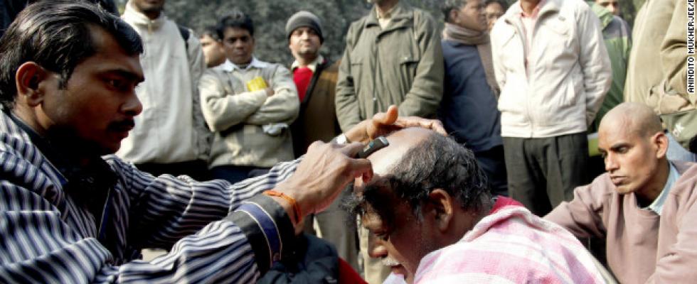 Image credit: Ripple News website - An Indian activist gets his head shaven in protest against the Dehli gang-rape related to bus transport