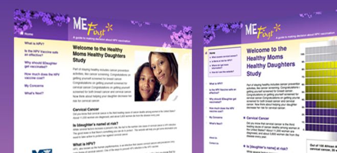 All female students aged 18-26 years who reported being unvaccinated against HPV at a midwestern US university were invited via email to enroll in the study. Participants completed a 144-question online survey that assessed baseline HPV vaccine-related knowledge, attitudes, and vaccination intention. Participants (n = 661) were then randomised to receive either the MeFirst intervention or a standard Centers for Disease Control and Prevention (CDC) information factsheet on HPV vaccine (control). MeFirst was a unique, tailored website automatically configured for the individual participant based on their baseline survey responses. It consisted of 7 tailored topic webpages that the participant could toggle through using a navigation bar. The topic pages had factual information on HPV and the HPV vaccine, as well as suggestions for how to talk to a doctor about the vaccine. Tailoring was multifaceted but focused on barriers to vaccination the participant had previously endorsed, such as perceived susceptibility, and included addressing the participant by their first name, using their doctor's name, and displaying background photos of young women of the same self-identified racial background as the participant. In total, up to 160 items could be tailored to the participant on their individual MeFirst website.