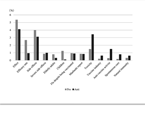 - The 3 most frequently appearing content topics on pro-vaccination websites were: vaccination effect for preventing serious cases of influenza, side effects of vaccination, and efficacy rate of vaccination. The 3 most frequent topics on anti-vaccination websites were: ineffectiveness of influenza vaccination, toxicity of vaccination, and side effects of vaccination.