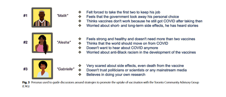 - Feeding back and interpreting research findings - The team, with CAGs, developed "personas", who represented fictitious individuals in each community, as a way of presenting the themes and perspectives derived from the qualitative interviews. In-depth feedback sessions enabled members of each CAG to validate recommendations emerging from their community before they were shared with PHUs. The research team held a final meeting with each CAG to reflect on collective progress, areas of learning and mutual growth, and wasy in which their input directly influenced public health recommendations. Members of each CAG also received the findings of an independent evaluation of the engagement process to demonstrate the value of the study. Recommendations were then shared through policy briefs with key stakeholders from each PHU, and meetings were held to discuss recommendations. Sample recommendation: Identify examples from within communities where people have changed their minds about the vaccine to amplify (e.g., on video screens displayed while people are waiting at wellness clinics), especially featuring stories from local community leaders, community ambassadors, and relatable "regular people".