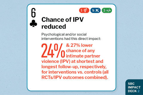 Strategy researched Psychological and/or social interventions (not simply provision of material resources) in individual and group format, sexual and/or health education and counselling, and educational discussion groups, as well as community mobilisation interventions and comprehensive community resource provision that included psychosocial support Impact achieved Country of study LMICs Research methodology Meta-analysis of 13 RCTs Journal Journal of Global Health; 2020 Journal paper title and link Excerpt from Abstract "Psychosocial interventions reduced any form of IPV by 27% at shortest (relative risk (RR)= 0.73) and 25% at longest (RR= 0.75) follow up. Physical IPV was reduced by 22% at shortest (RR= 0.78) and 27% at longest (RR= 0.73) follow up. Sexual IPV was reduced by 23% at longest follow up (RR= 0.77) but showed no significant effect at shortest follow-up." |