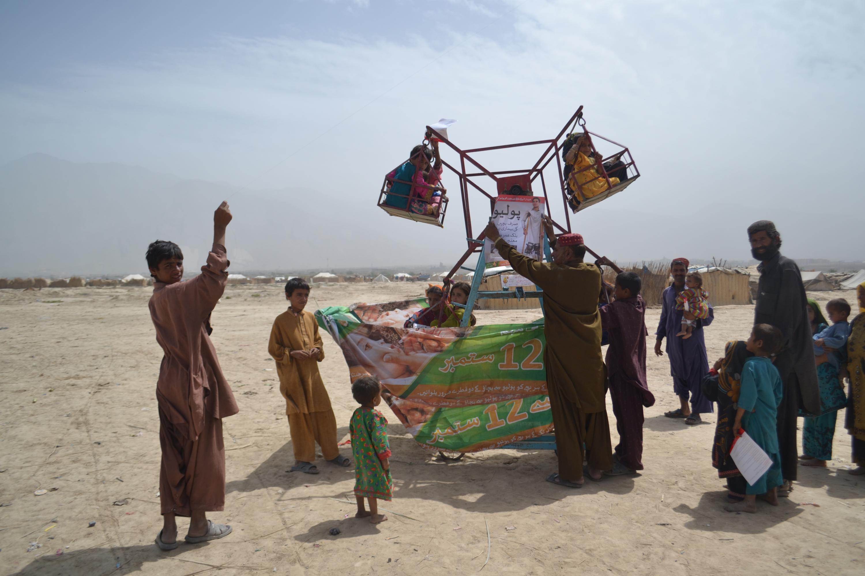 During the activity, the parents were briefed on importance of vaccination and hygiene. Female social mobilizers went tent-to-tent to inform families about vaccination and bring out children for immunization. A large number of children gathered around the swing; parents brought their children enthusiastically to play and receive polio drops.