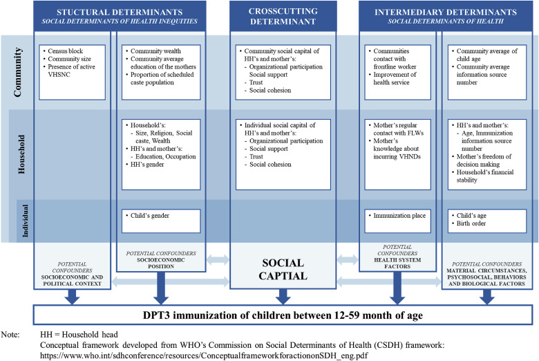 Multilevel mixed-effect logistic regressions were employed to assess the association of social capital measure with DPT3 immunisation, considering individual children as level 1 (e.g., gender was considered an individual-level structural determinant), households as level 2 (e.g., perceived ability of decision making (How much freedom do you have in making personal decisions) and knowledge about immunisation (the number of sources from where the mother received information about immunisation) were included as intermediary determinants), and Gram Panchayats (GPs) or communities as level 3 (e.g., percentage of mothers in the community with regular contact with FLWs was considered an intermediary determinant).