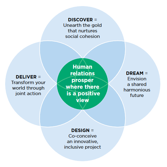 This guide from Catholic Relief Services (CRS) is an instrument to instruct and inspire practitioners to restore broken relationships, overcome mistrust, reduce hatred and mitigate violence. CRS uses a definition of social cohesion that closely approximates that of the Council of Europe, "the capacity of a society to sustainably ensure the wellbeing of all its members, namely equitable access to available resources, respect of dignity in diversity, personal and collective empowerment, and responsible participation." The guide combines the 4Ds of Appreciative Inquiry (AI - "Discover, Dream, Design, and Deliver") with the 3Bs CRS' people-to-people peacebuilding methodology ("Binding, Bonding, and Bridging"). It is designed to help groups address disagreements and disputes, find common ground, collaborate for mutual benefit, and envision a harmonious future.