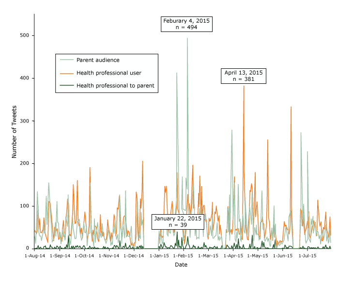 The researchers used data mining software to access the Twitter Search API to collect prospective data. They defined inclusion criteria as tweets that contained any of 5 search terms related to the HPV vaccine ("HPV", "HPV vaccine", "HPV shot", "Gardasil", and "Cervarix"), as well as the 5 corresponding hashtags. The final data set contained 193,379 English-only tweets collected from August 1 2014 through July 31 2015; it included both original tweets and retweets. They operationalised their 3 subsample tweet types using the following study variables: 1) type of user = health professional; 2) target audience = parent; and 3) type of user = health professional AND target audience = parent (consisting of an overlap of the first 2 categories). For each type of tweet, they identified the period with the highest volume of tweets (or "spikes"). To examine activity surrounding these spikes, they considered 3 days before and after each spike, totaling a 7-day period.